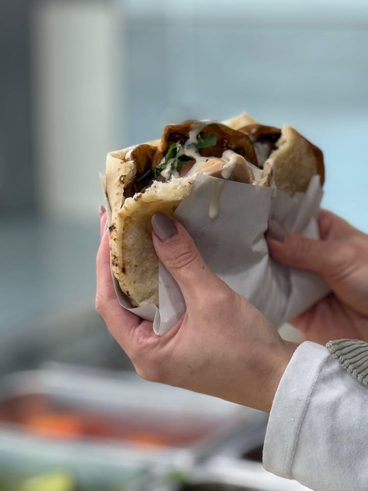 הפיתה נפתחת בנדיבות ומקבלת בתוכה חציל מטוגן בדיוק כמו שצריך, ביצה חומה, עארוק ירוק ועסיסי, סלטים טריים, טחינה, חומוס וסלט קורקו הייחודי שלנו – הכול בהרמוניה מושלמת של טעמים.
